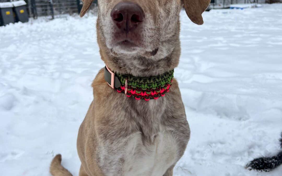 Ein heller Hund sitzt aufmerksam im verschneiten Winterwald und trägt das handgefertigte Makramee-Biothane Hundehalsband „Forest Gum“ in Olivgrün mit leuchtenden Neonkorall-Akzenten. Die breite Flechtung liegt angenehm am Hals an und setzt einen ausdrucksstarken Farbakzent vor der natürlichen Winterkulisse. Das wasserfeste und robuste Material macht das Halsband zum idealen Begleiter für Spaziergänge bei jedem Wetter – bequem, langlebig und ein echter Blickfang.