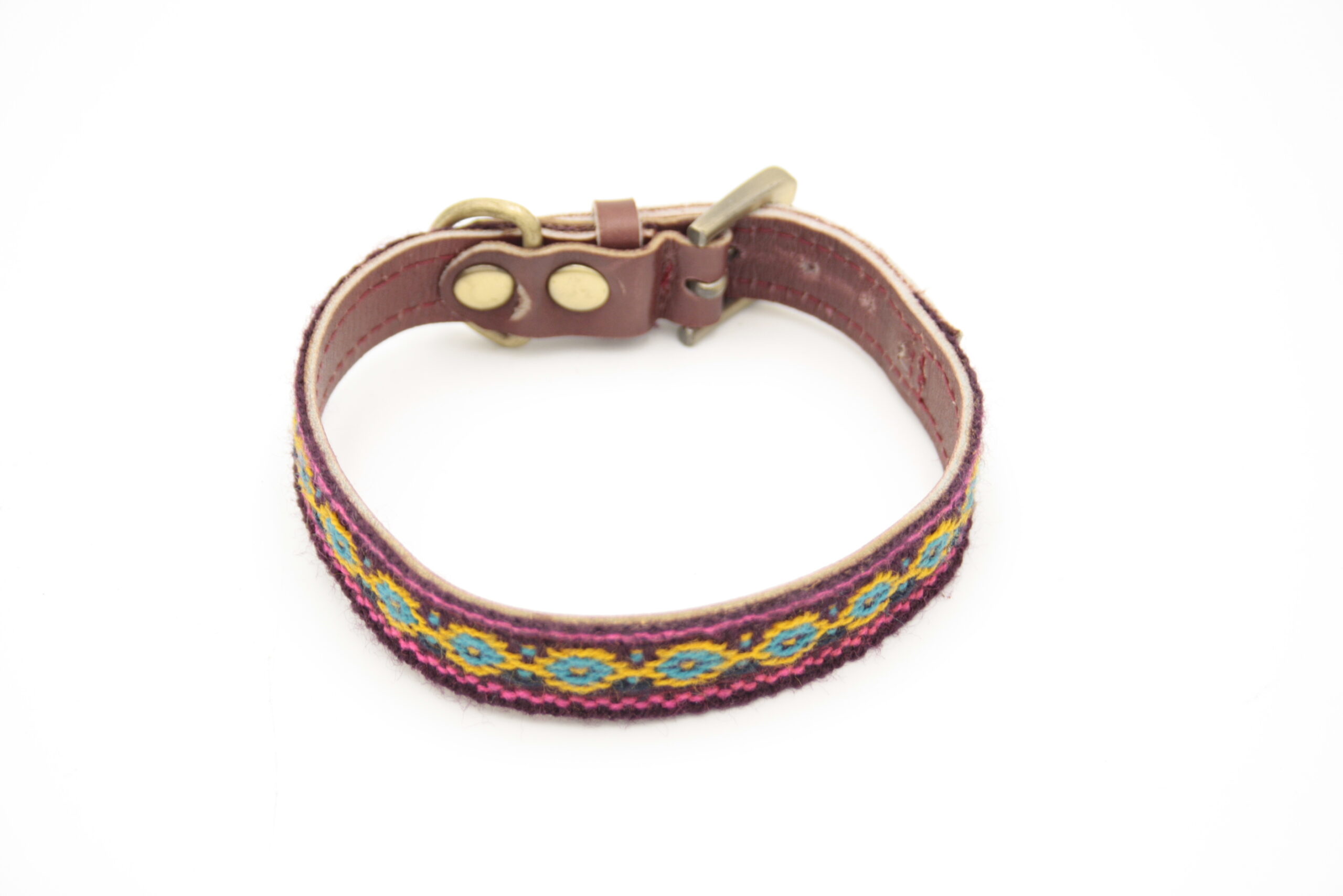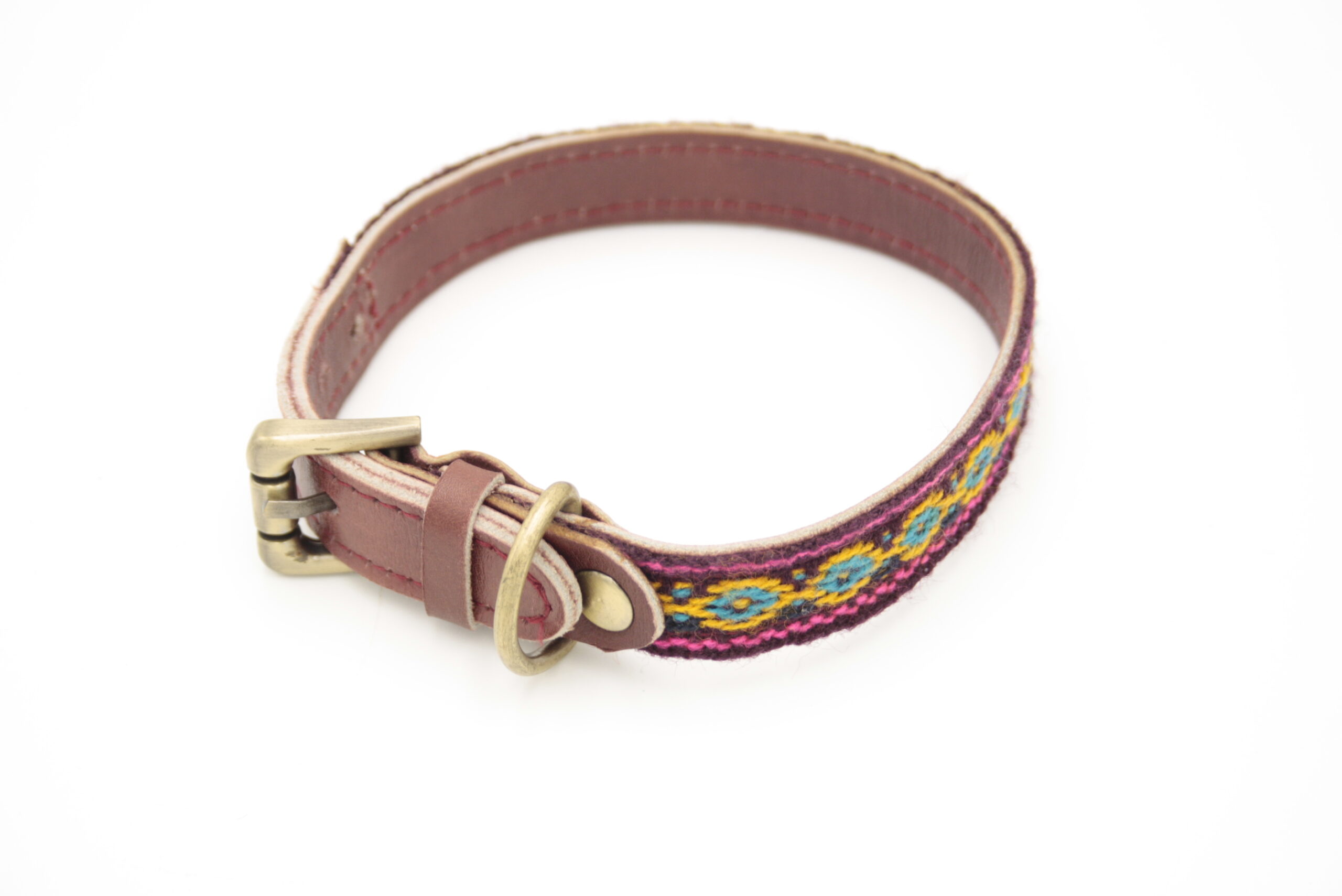 Boho Hundehalsband aus antikem handgewebtem Wolltextil aus Peru, auf Leder verarbeitet und mit antiken Messingbeschlägen kombiniert. Jedes Stück ist ein individuelles Einzelstück.