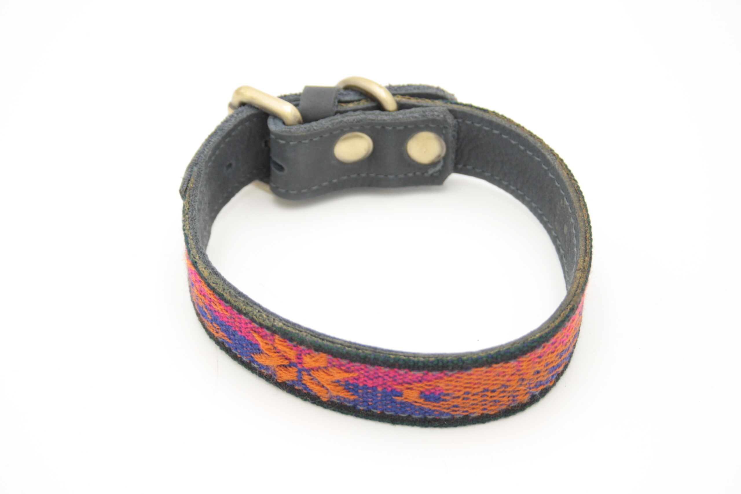 Das textile Band wird sorgfältig auf stabiles Leder aufgenäht und mit Metallbeschlägen aus antikem Messing kombiniert. Dadurch entsteht ein langlebiges Halsband mit einer besonderen handwerklichen Ausstrahlung.