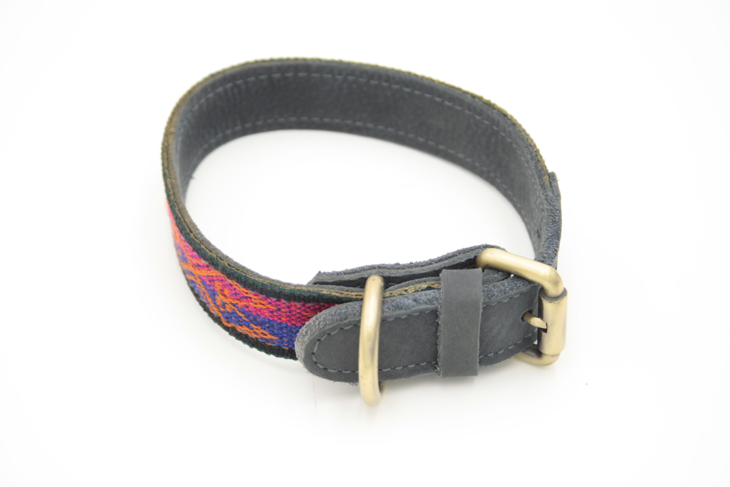 Boho Hundehalsband aus antikem handgewebtem Wolltextil aus Peru, auf Leder verarbeitet und mit antiken Messingbeschlägen kombiniert. Jedes Stück ist ein individuelles Einzelstück.