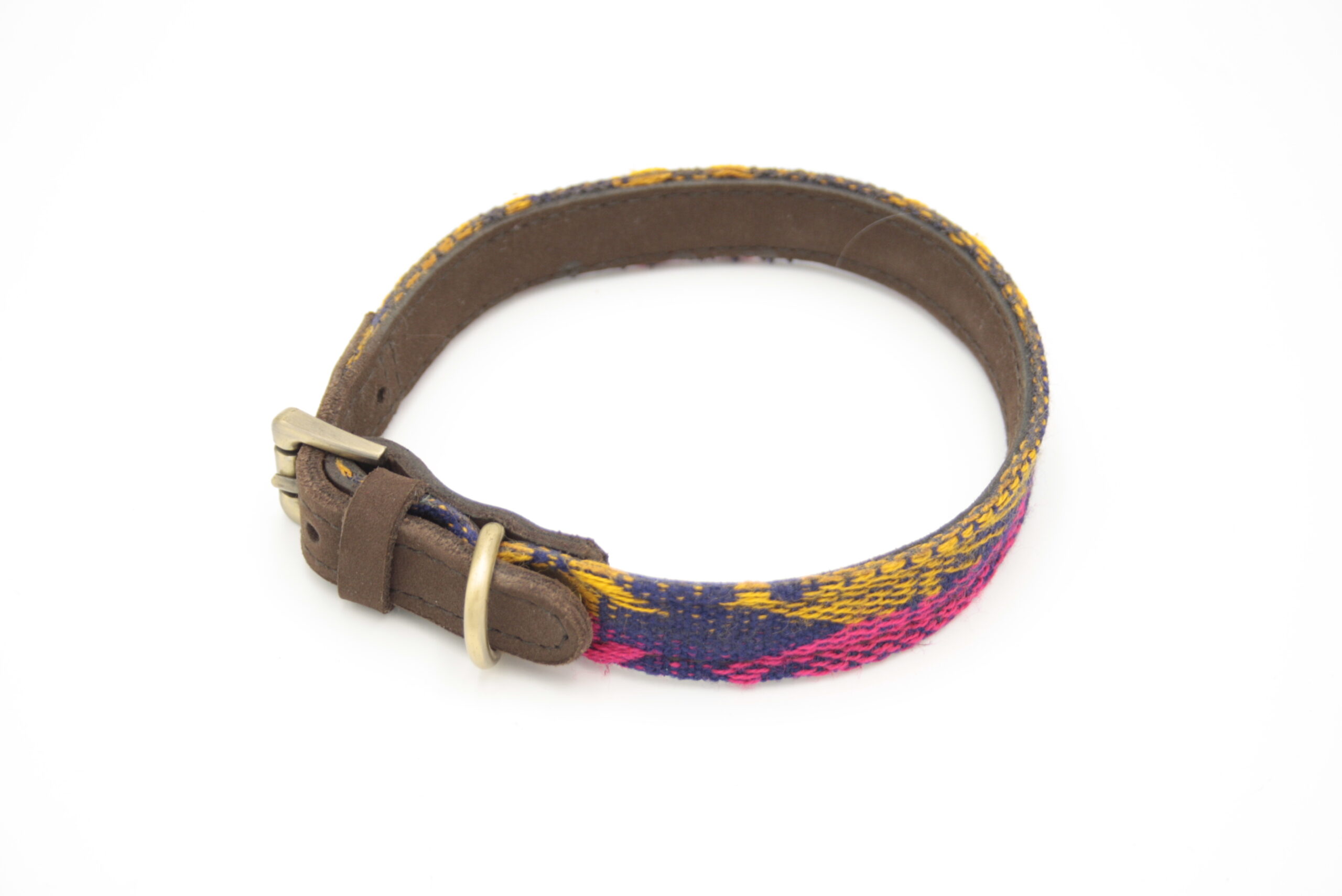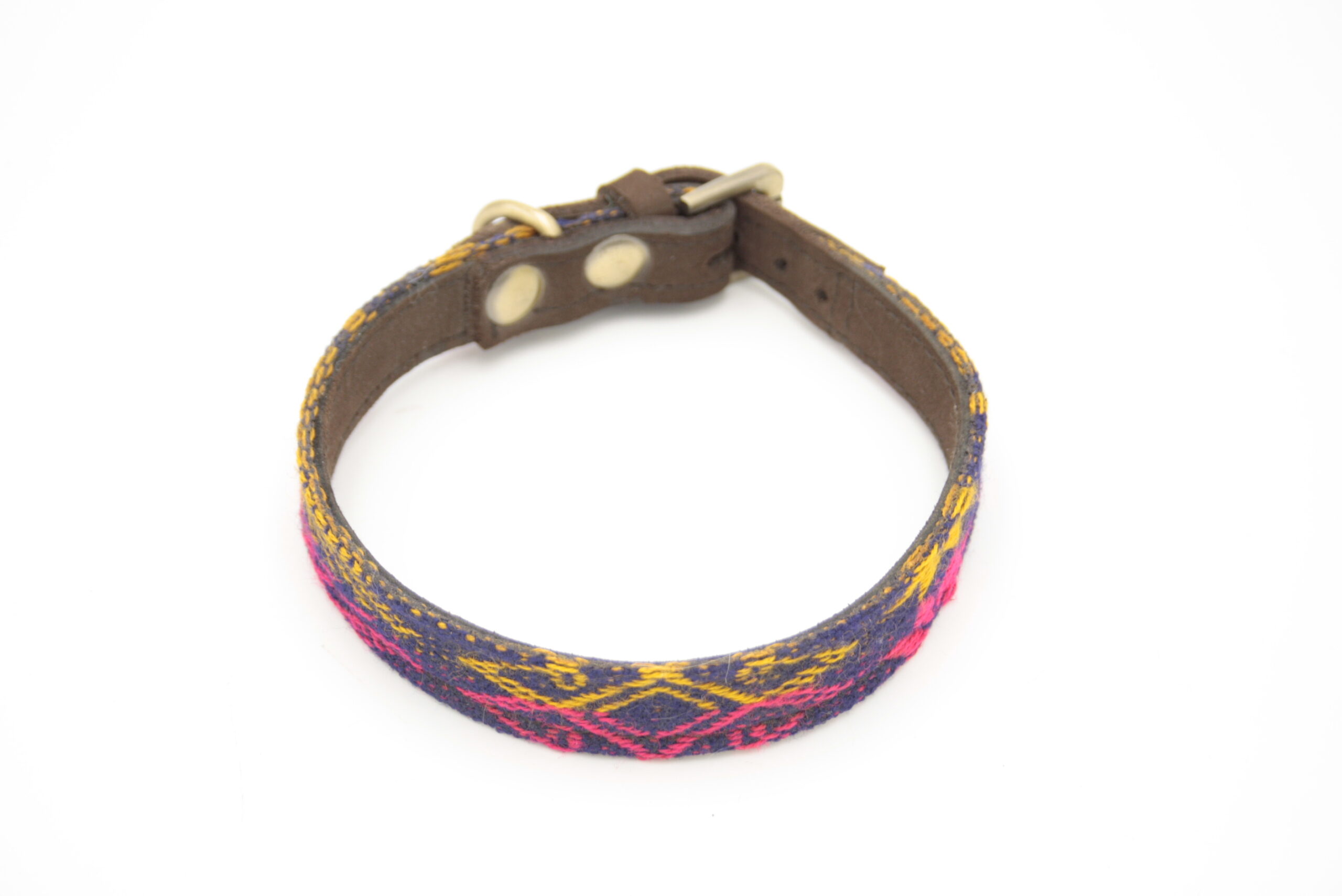 Boho Hundehalsband aus antikem handgewebtem Wolltextil aus Peru, auf Leder verarbeitet und mit antiken Messingbeschlägen kombiniert. Jedes Stück ist ein individuelles Einzelstück.