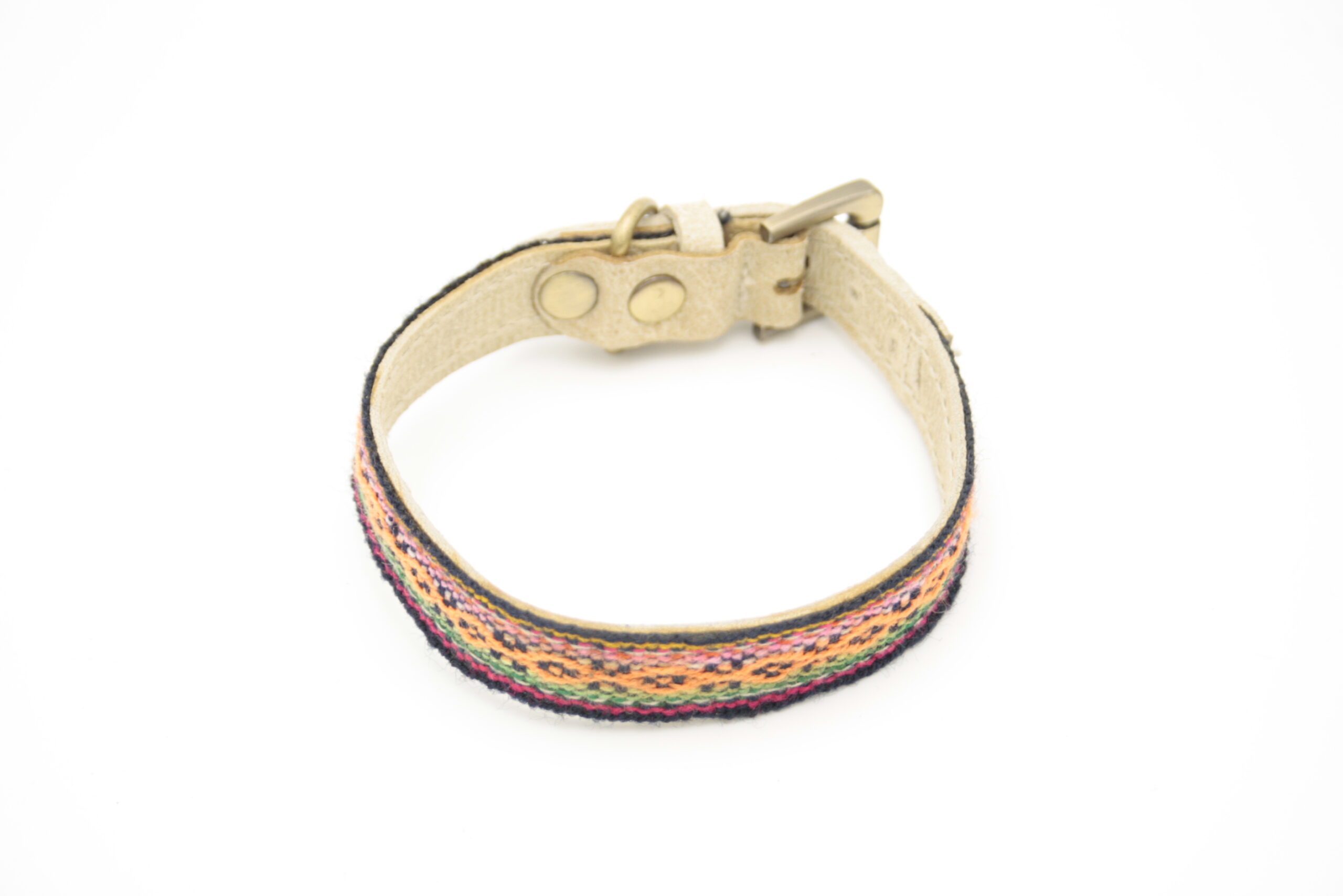 Das textile Band wird sorgfältig auf stabiles Leder aufgenäht und mit Metallbeschlägen aus antikem Messing kombiniert. Dadurch entsteht ein langlebiges Halsband mit einer besonderen handwerklichen Ausstrahlung.