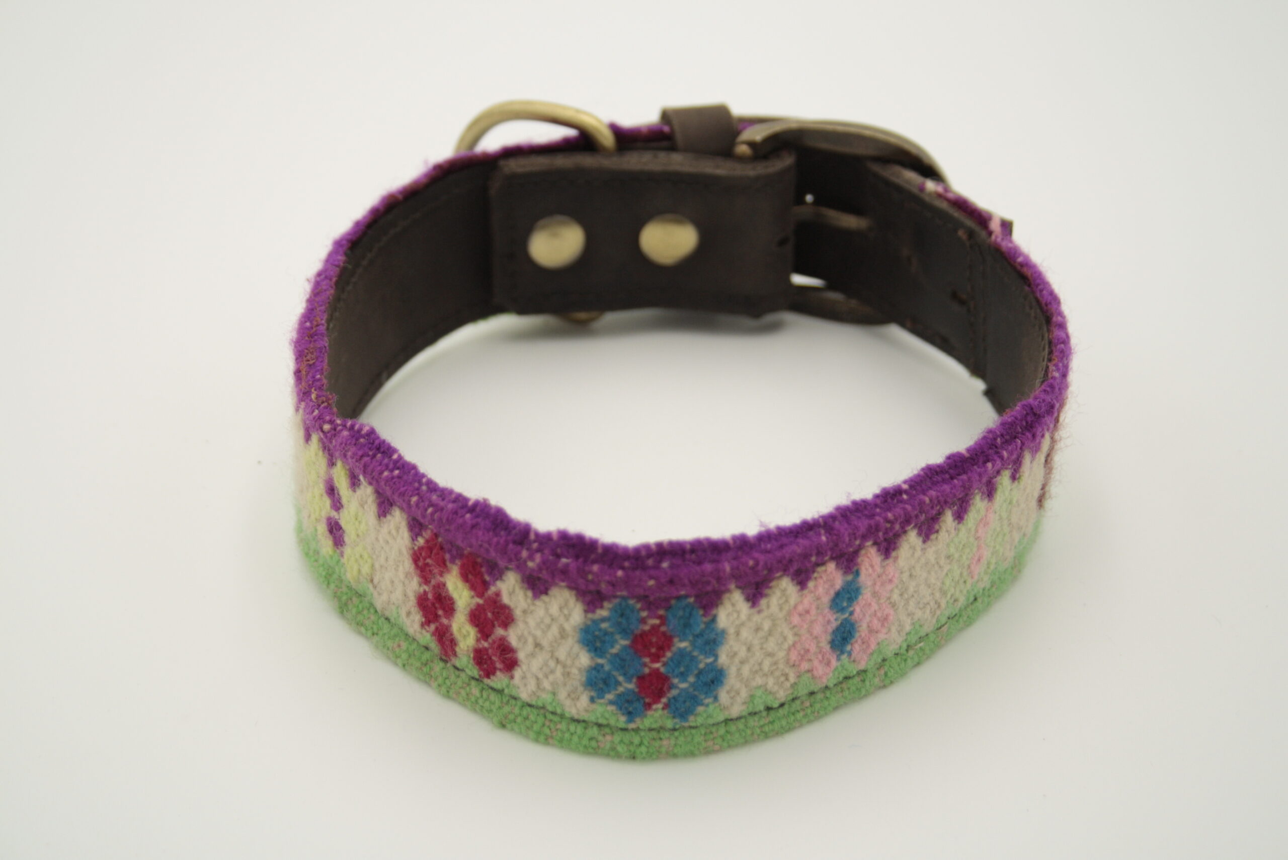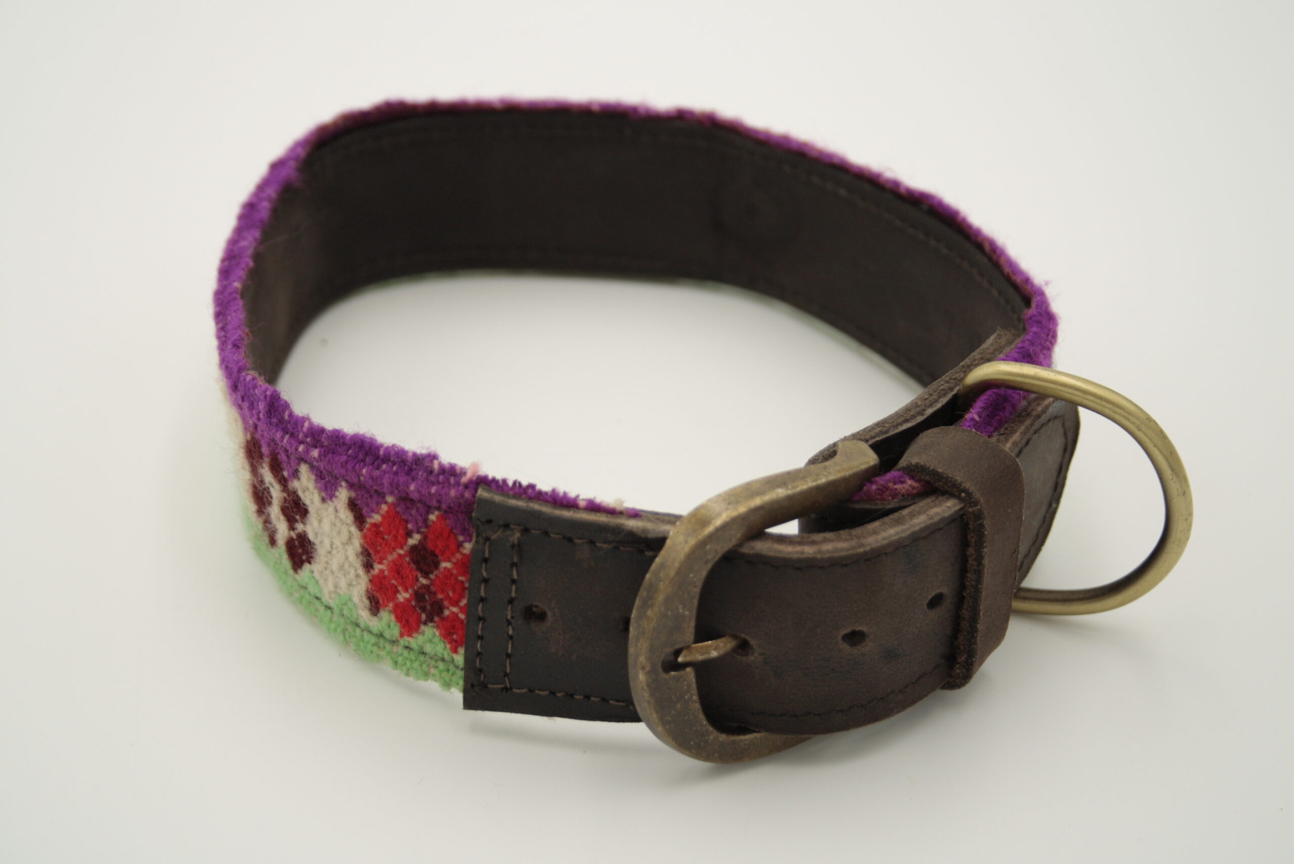 dunkel braunes Leder, handgewebter Wollstoff, multicolor ( hell grün, lila,hell rosa,blau,lila,rot,)