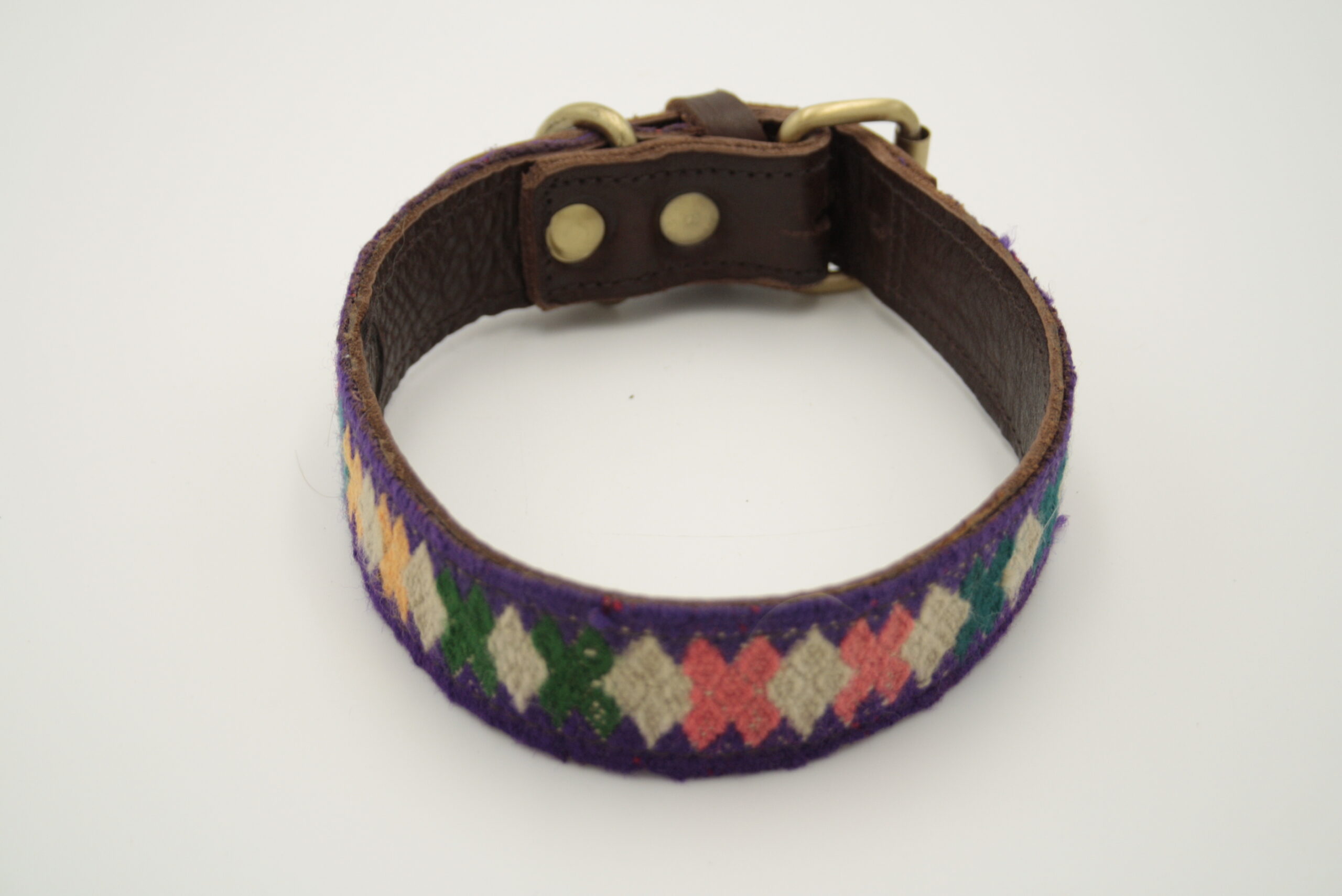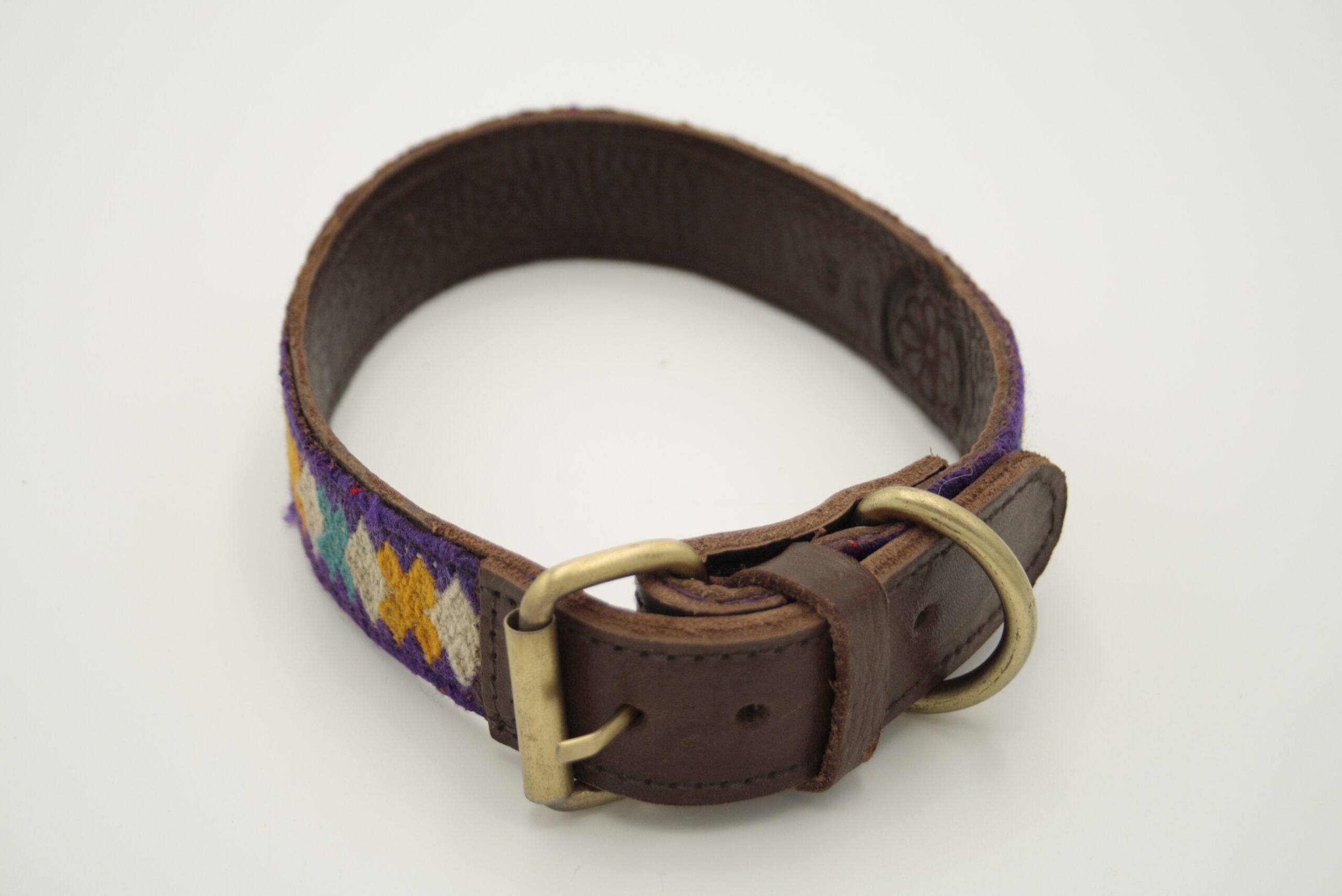 braunes Leder, handgewebter Wollstoff, multicolor ( lila,weiß,grün,rosa,gelb,blau,pink,hell grün)